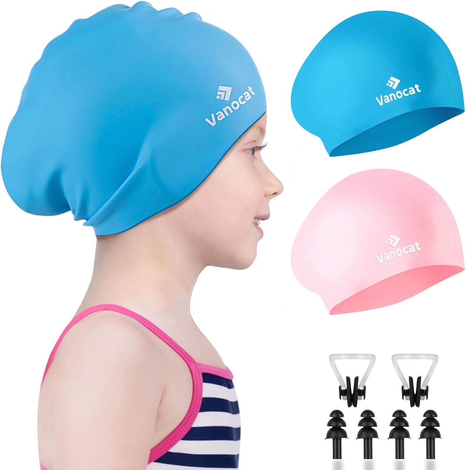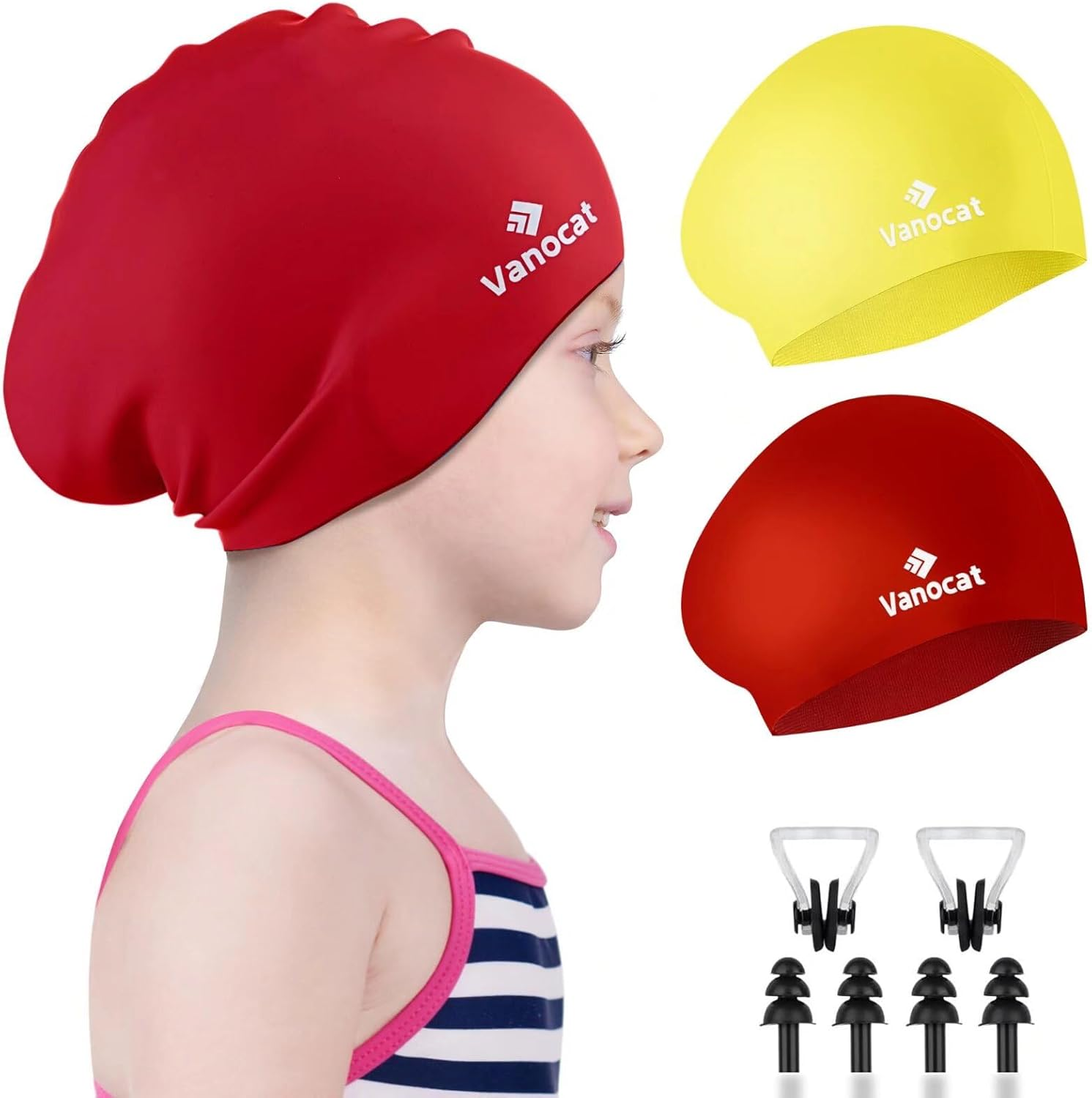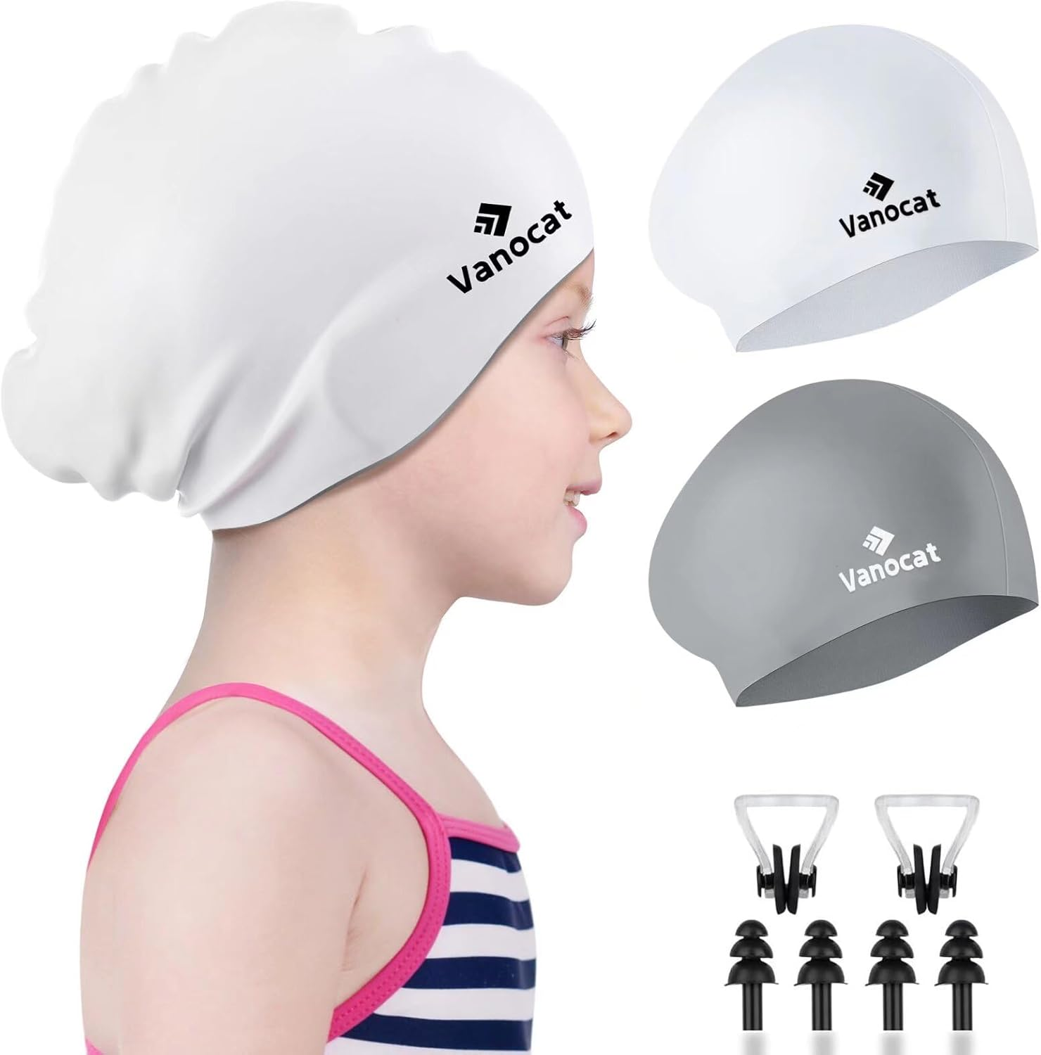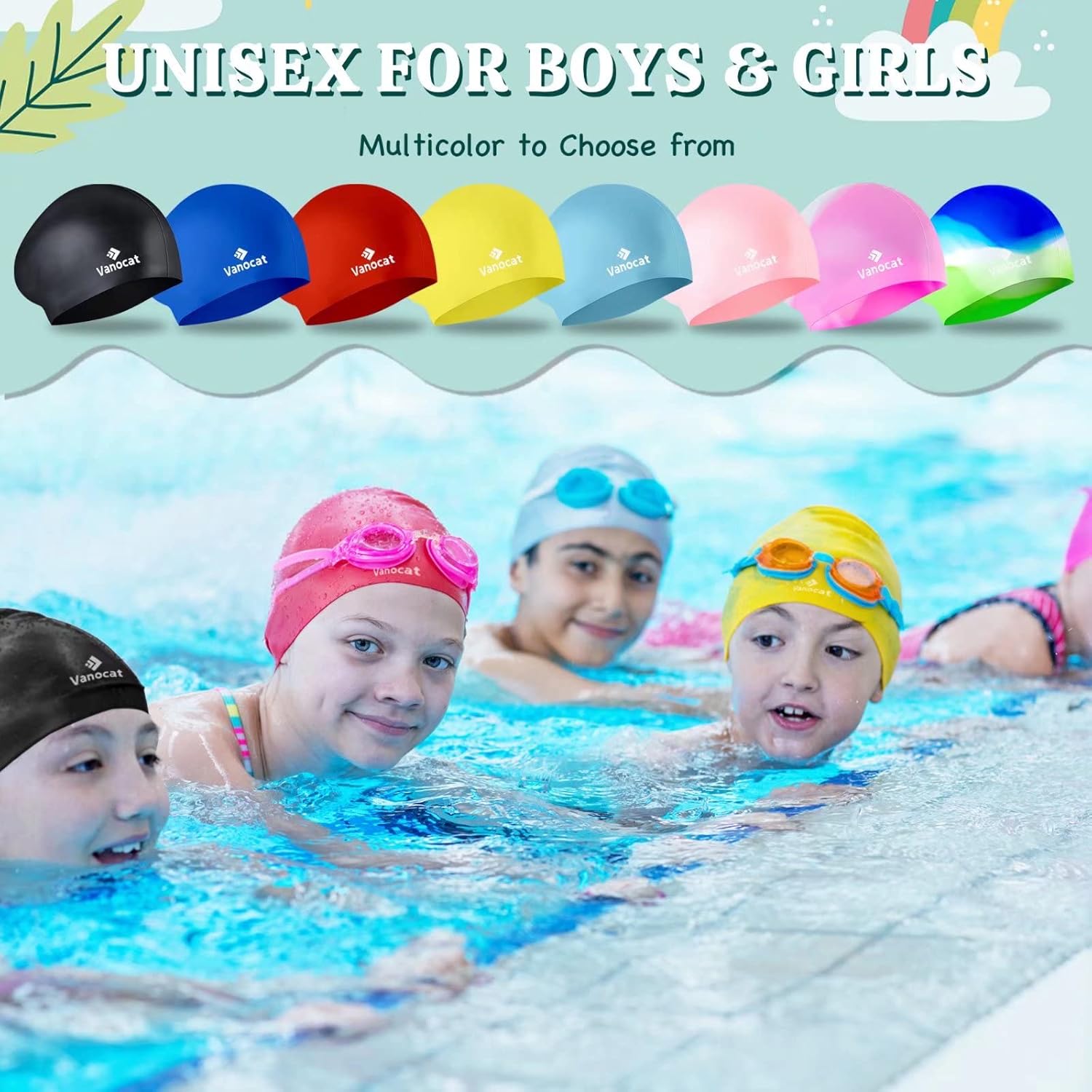 - [Premium & Waterproof Silicone Material]: Vanocat kids swim caps are made of high quality and durable silicone, which have the advantage of waterproof, high elastic and tear-resistant, so that the children swim caps can be stretched easily to achieve the best wearing effect, no deformation after repeated use. The material is also non-toxic, skin-friendly, wrinkle-free, comfortable and safe to use!